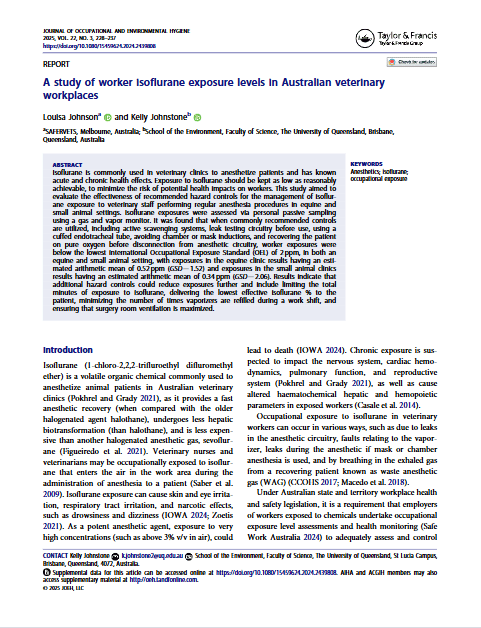 A study of worker isoflurane exposure levels in Australian veterinary workplaces.